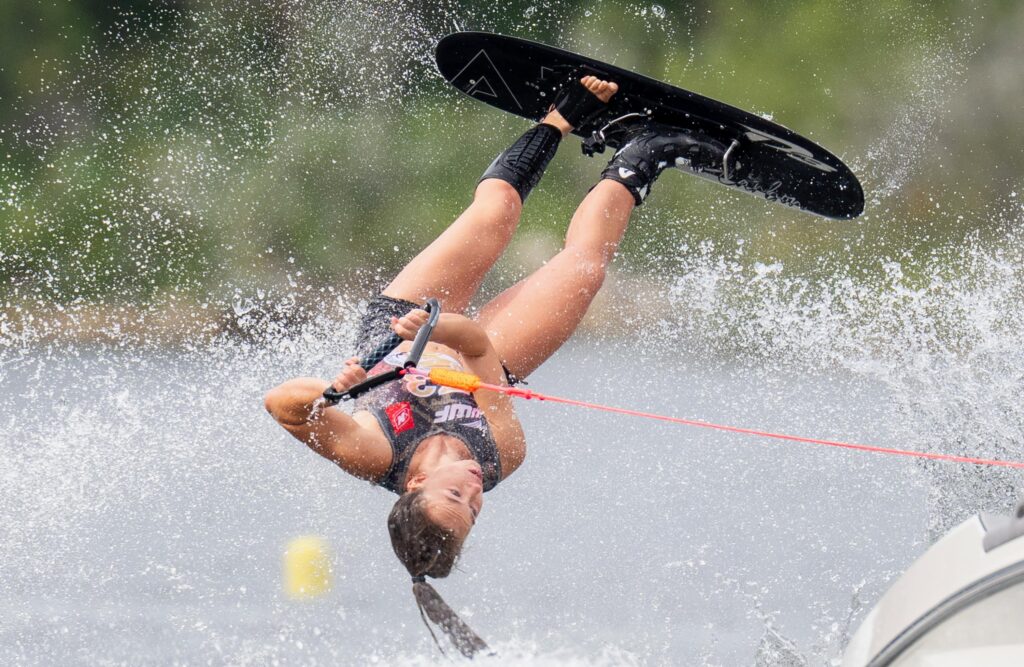 When it comes to tricks, Olivia’s favourite is the toe pass, where the skier performs a series of moves holding on to the tow rope by only a foot. She credits her dance background for her strong ability to toe ski. Then, when it comes to hand passes, where the skier has the tow rope in their hand, Olivia recently got her front flip, a very difficult move in waterskiing that she says only a handful of elite women in the world can complete.